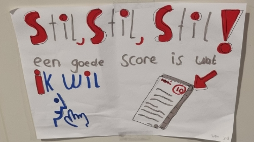 Als voorbereiding op de toetsochtenden, maakten de kinderen bordjes met daarop kreten en tekeningen om iedereen in de school duidelijk te maken, dat ze bezig zijn met dé toets en of iedereen daar wel rekening mee wil houden!